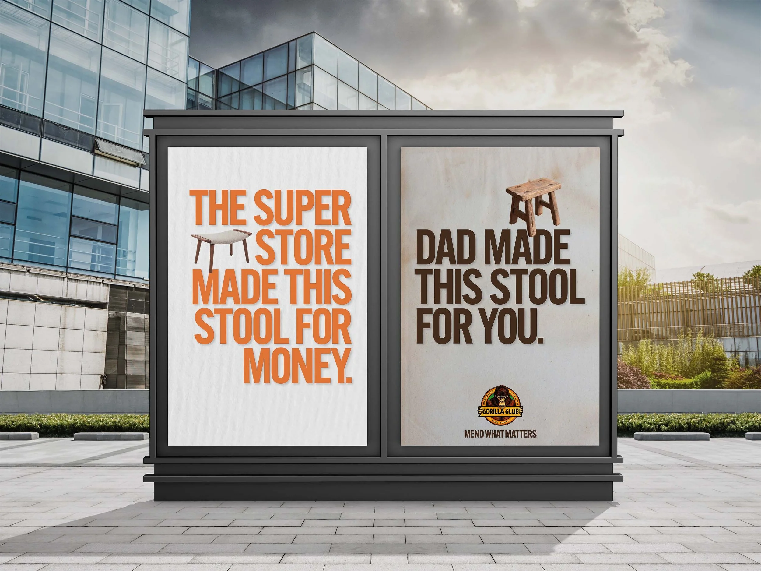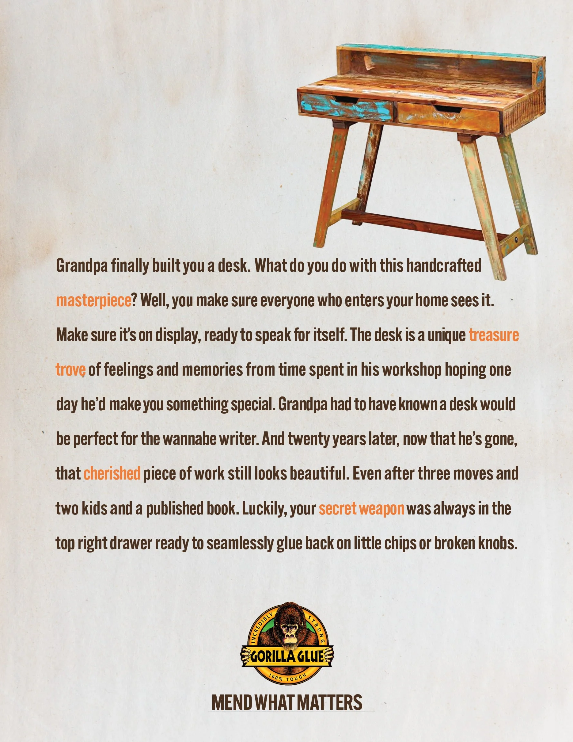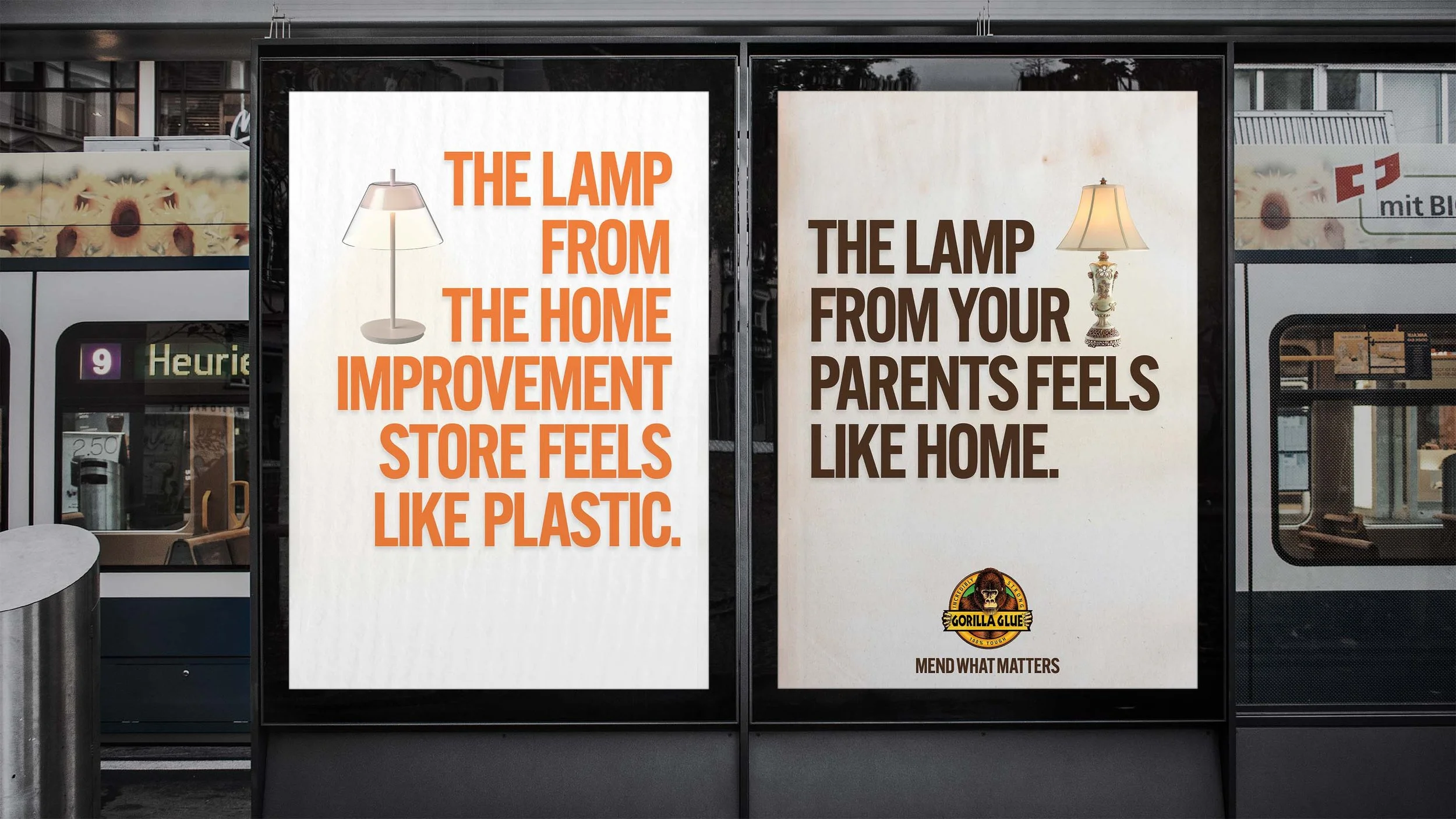Gorilla GlueWe live in a throw-away society, but all the new stuff has none of the old stuff’s character. Gorilla Glue mends what matters most to you.Scroll ↓ OOH Print school // The Creative Circusart director // Kate Budorick